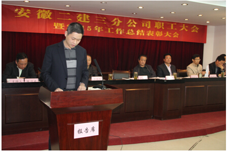 分公司黨支部書記陳習(xí)武在會(huì)議上就2015年分公司黨務(wù)、工會(huì)工作做了總結(jié)發(fā)言,并強(qiáng)調(diào)2016年分公司黨務(wù)、工會(huì)工作要繼續(xù)以“全面貫徹黨的十八大、十八屆三中、四中、五中全會(huì)精神,深入落實(shí)集團(tuán)首屆職代會(huì)精神及二建公司十五屆三次職代會(huì)精神”為主要工作,夯實(shí)基礎(chǔ),充分發(fā)揮群團(tuán)組織作用,加強(qiáng)宣傳思想政治工作,推動(dòng)企業(yè)企務(wù)公開,堅(jiān)持黨風(fēng)廉政建設(shè)和反腐倡廉工作,為促進(jìn)企業(yè)和諧穩(wěn)定發(fā)展保駕護(hù)航。